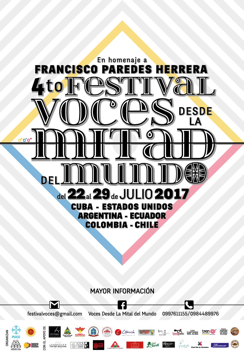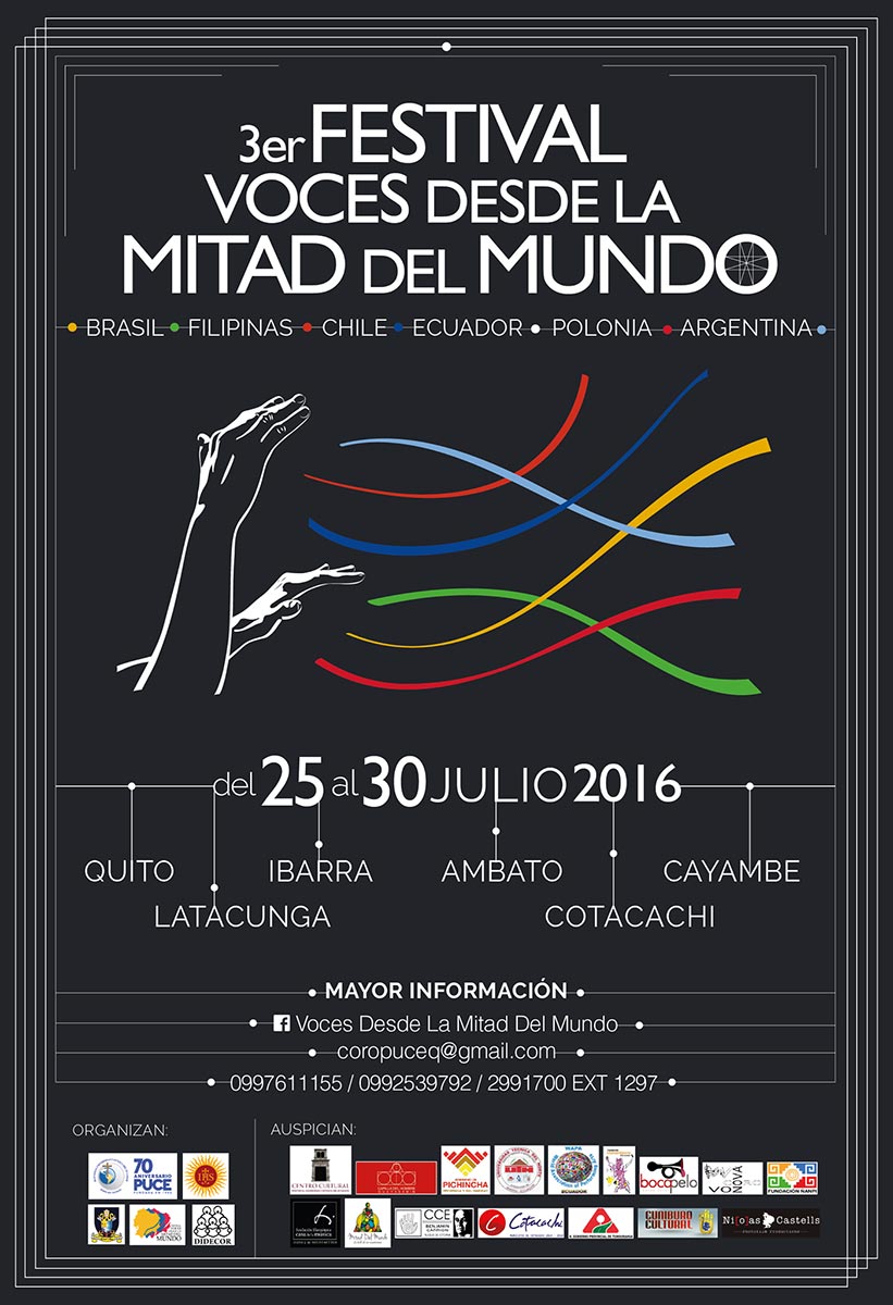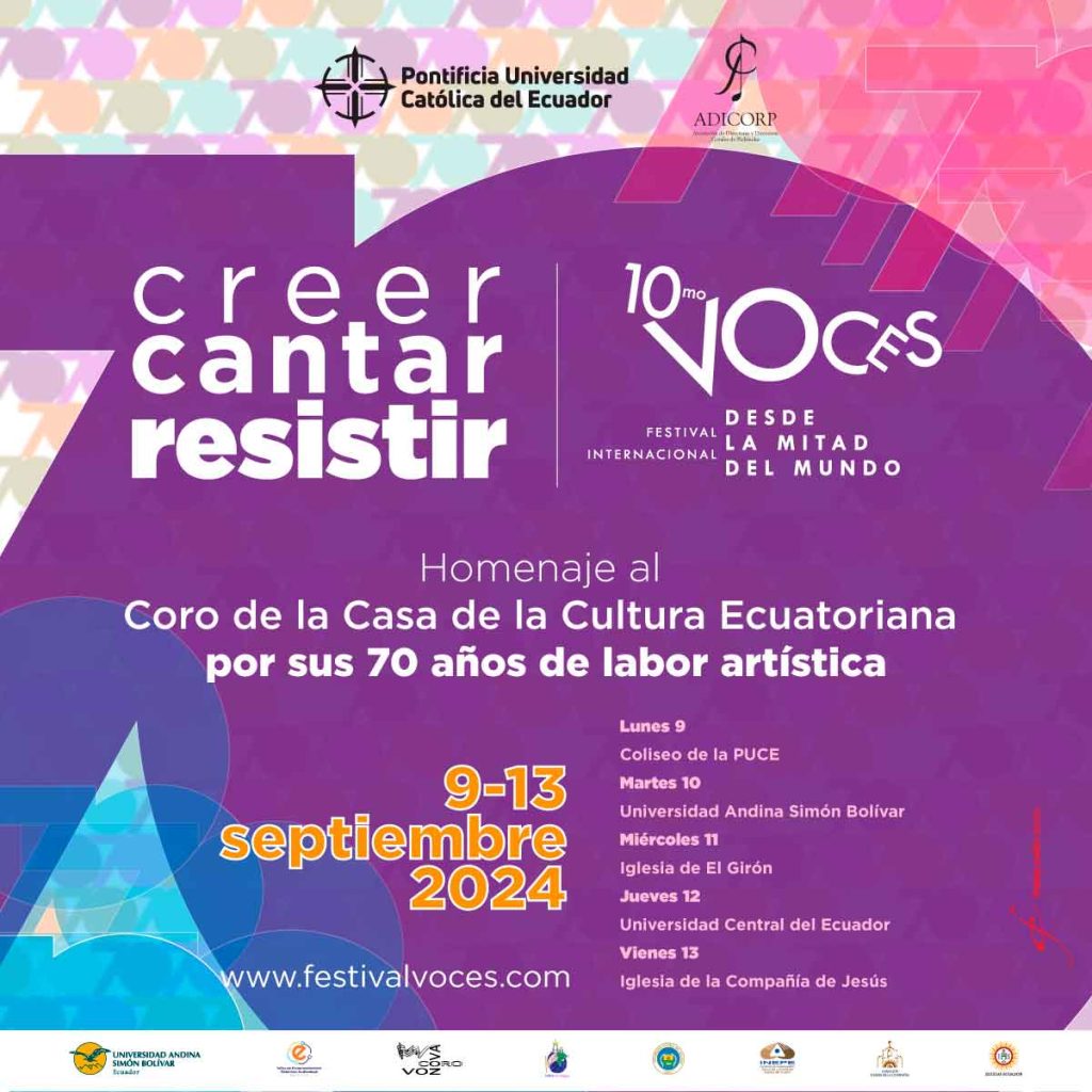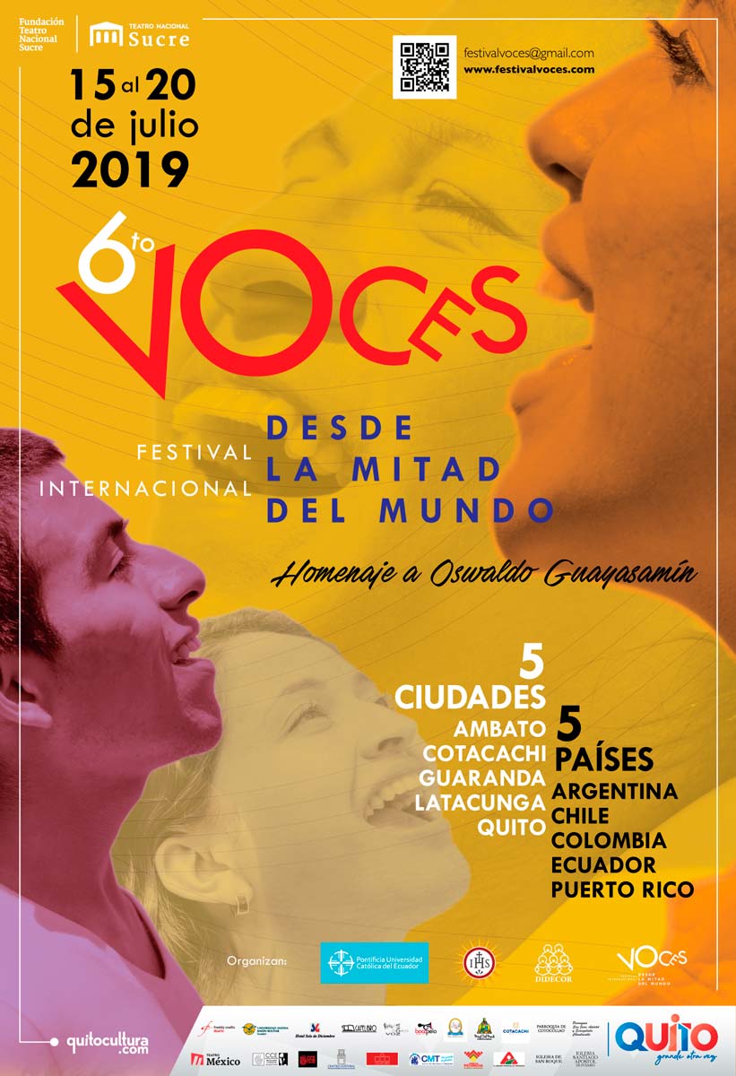 Ediciones anteriores El Festival nace en 2014. Aquí puedes conocer más acerca de las ediciones anteriores: 202410mo Festival Internacional Voces desde la Mitad del MundoJornadas Corales9 · 16 · 23 · 30 de septiembreQuito 20239no Festival Internacional Voces desde la Mitad del MundoJornadas Corales9 · 16 · 23 · 30 de septiembreQuito 20228vo Festival Internacional Voces desde la Mitad del MundoDel 6 al 9 de septiembreQuito 20217mo Festival Internacional Voces desde la Mitad del MundoPara la esperanzaDel 9 al 13 de agostoEdición virtual 20196to Festival Internacional Voces desde la Mitad del MundoHomenaje a Oswaldo GuayasamínDel 15 al 20 de julioAmbato, Cotacachi, Guarada, Latacunga, Quito 20185to Festival Internacional Voces desde la Mitad del MundoHomenaje a Enrique Gil CalderónDel 23 al 28 de julioQuito, Ibarra, Guaranda, Ambato, Cotacachi, Latacunga, Otavalo 20174to Festival Voces desde la Mitad del MundoHomenaje a Francisco Paredes HerreraDel 22 al 29 de julioQuito, Guaranda, Ambato, Latacunga, Cayambe, Cotacachi, Ibarra y Tulcán 20163er Festival Voces desde la Mitad del MundoDel 25 al 30 de julioQuito, Latacunga, Ibarra, Ambato, Cotacachi, Cayambe 20152do Encuentro Internacional de Coros Voces desde la Mitad del MundoDel 21 al 25 de julioQuito, Ambato, Tulcán, Latacunga, Cayambe 20141er Encuentro Internacional Voces de Altura Canto en la Mitad del MundoDel 22 al 25 de julioQuito, Ambato, Latacunga, Saquisilí